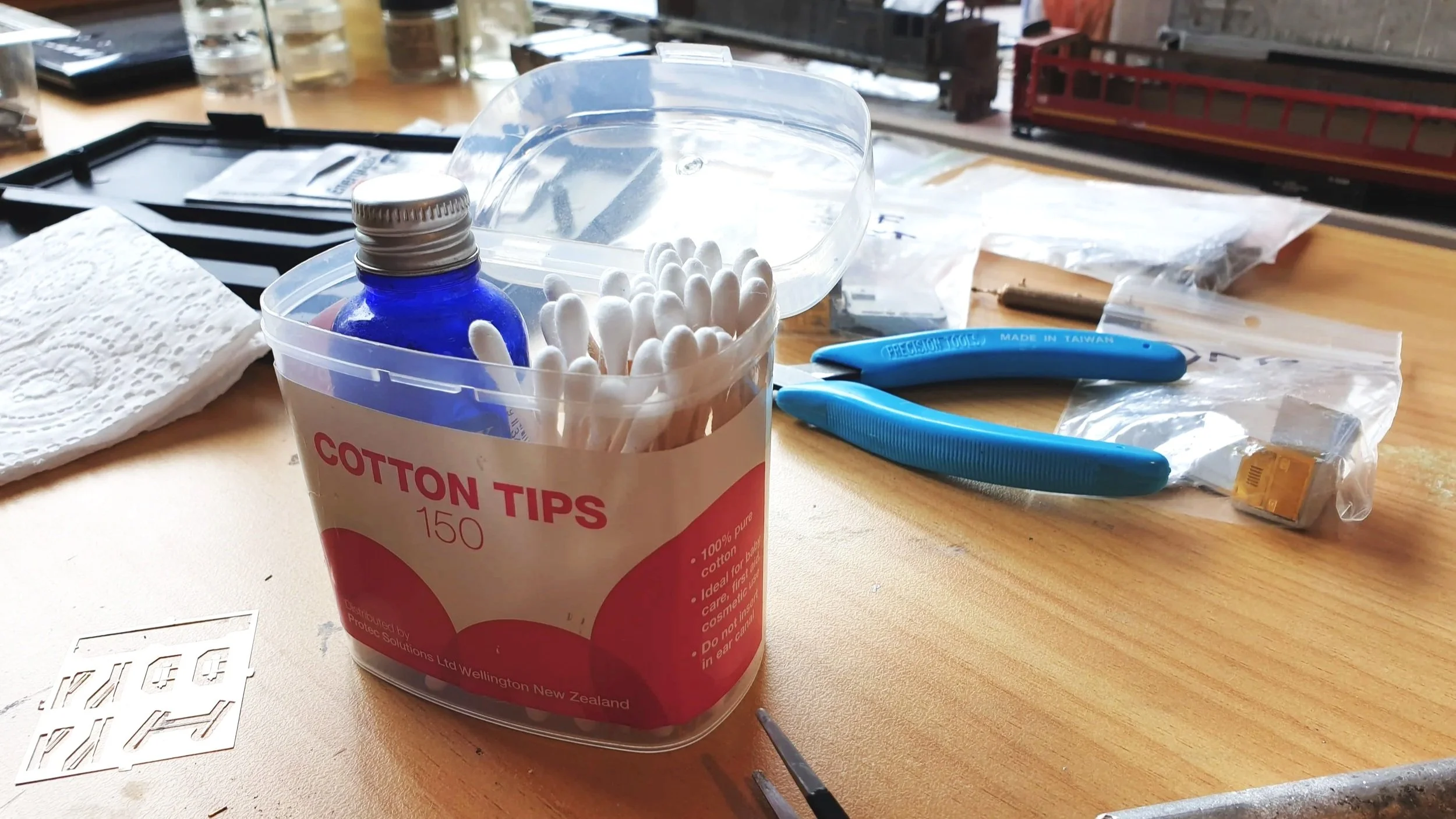 Michael’s preferred flux delivery system is the bottle with the eye dropper in the lid, which is fine. But sometimes a drop is too much and eventually the rubber that makes that dropper work, will suffer the consequences of living with an acid and need replacing. My preferred flux delivery method is to use a cotton bud. So, I get the bottles with the plain lid. Coincidentally, it fits in the container that the cotton buds come in! Which is excellent for containing a liquid when you want to travel to a train show to build trains.